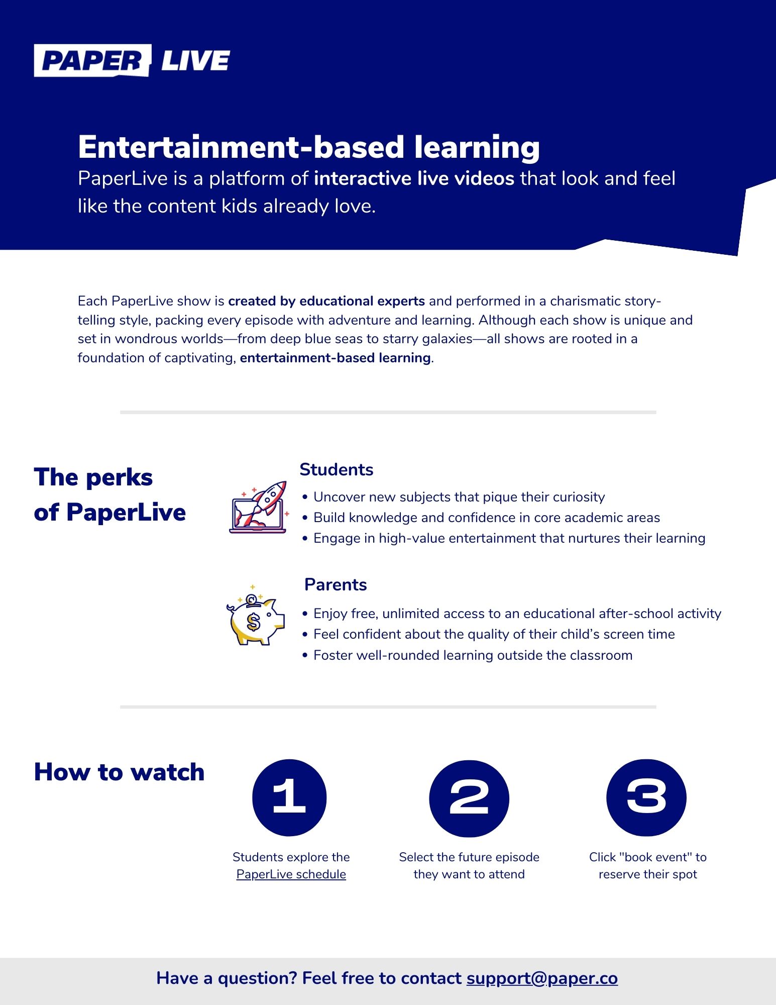 PaperLive is a new after-school enrichment program. Created by academic experts, it offers interactive live videos that look and feel like television shows. Both entertaining and educational, these shows are tons of fun and encourage learning outside of the classroom. Shows cover core topics like STEM, Spanish and history, as well as non-traditional subjects like astronomy, financial literacy and critical thinking.